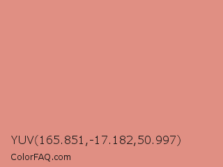 YUV 165.851,-17.182,50.997 Color is a light red color and the nearest color is My Pink #d69188. Hex code #e08f83 and RGB value is rgb(224,143,131). In RGB color space, this color is composed of 88% red, 56% green, 51% blue, In CMYK color space, this color is composed of 0% cyan, 36% magenta, 42% yellow , 12% black , In HSL color space, this color has a hue angle of 8° , 60% saturation and 70% lightness.