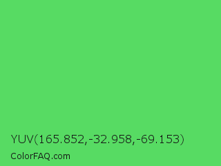 YUV 165.852,-32.958,-69.153 Color is a normal green color and the nearest color is Emerald #50c878. Hex code #57db63 and RGB value is rgb(87,219,99). In RGB color space, this color is composed of 34% red, 86% green, 39% blue, In CMYK color space, this color is composed of 60% cyan, 0% magenta, 55% yellow , 14% black , In HSL color space, this color has a hue angle of 125° , 65% saturation and 60% lightness.