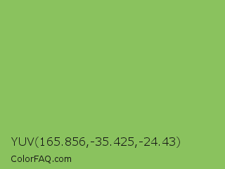 YUV 165.856,-35.425,-24.43 Color is a normal green color and the nearest color is Dollar Bill #85bb65. Hex code #8ac25e and RGB value is rgb(138,194,94). In RGB color space, this color is composed of 54% red, 76% green, 37% blue, In CMYK color space, this color is composed of 29% cyan, 0% magenta, 52% yellow , 24% black , In HSL color space, this color has a hue angle of 94° , 45% saturation and 56% lightness.