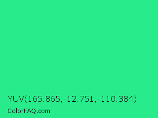 YUV 165.865,-12.751,-110.384 Color is a normal green color and the nearest color is Shamrock #33cc99. Hex code #28eb8c and RGB value is rgb(40,235,140). In RGB color space, this color is composed of 16% red, 92% green, 55% blue, In CMYK color space, this color is composed of 83% cyan, 0% magenta, 40% yellow , 8% black , In HSL color space, this color has a hue angle of 151° , 83% saturation and 54% lightness.