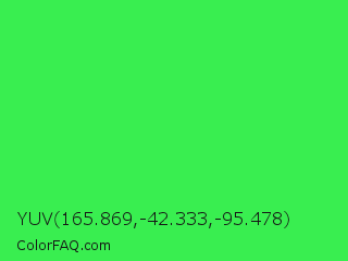 YUV 165.869,-42.333,-95.478 Color is a normal green color and the nearest color is UFO Green #3cd070. Hex code #39ee50 and RGB value is rgb(57,238,80). In RGB color space, this color is composed of 22% red, 93% green, 31% blue, In CMYK color space, this color is composed of 76% cyan, 0% magenta, 66% yellow , 7% black , In HSL color space, this color has a hue angle of 128° , 84% saturation and 58% lightness.