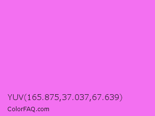 YUV 165.875,37.037,67.639 Color is a light magenta color and the nearest color is Pink Flamingo #fc74fd. Hex code #f370f1 and RGB value is rgb(243,112,241). In RGB color space, this color is composed of 95% red, 44% green, 95% blue, In CMYK color space, this color is composed of 0% cyan, 54% magenta, 1% yellow , 5% black , In HSL color space, this color has a hue angle of 301° , 85% saturation and 70% lightness.