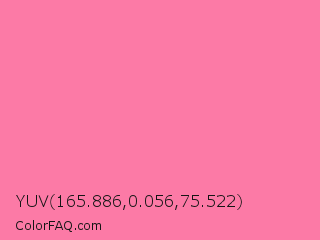 YUV 165.886,0.056,75.522 Color is a light rose color and the nearest color is Tickle Me Pink Crayola #fc80a5. Hex code #fc7aa6 and RGB value is rgb(252,122,166). In RGB color space, this color is composed of 99% red, 48% green, 65% blue, In CMYK color space, this color is composed of 0% cyan, 52% magenta, 34% yellow , 1% black , In HSL color space, this color has a hue angle of 340° , 96% saturation and 73% lightness.