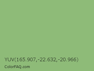 YUV 165.907,-22.632,-20.966 Color is a normal green color and the nearest color is Pistachio #93c572. Hex code #8ebb78 and RGB value is rgb(142,187,120). In RGB color space, this color is composed of 56% red, 73% green, 47% blue, In CMYK color space, this color is composed of 24% cyan, 0% magenta, 36% yellow , 27% black , In HSL color space, this color has a hue angle of 100° , 33% saturation and 60% lightness.