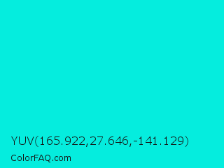 YUV 165.922,27.646,-141.129 Color is a normal cyan color and the nearest color is Bright Turquoise #08e8de. Hex code #05edde and RGB value is rgb(5,237,222). In RGB color space, this color is composed of 2% red, 93% green, 87% blue, In CMYK color space, this color is composed of 98% cyan, 0% magenta, 6% yellow , 7% black , In HSL color space, this color has a hue angle of 176° , 96% saturation and 47% lightness.