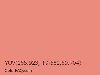 YUV 165.923,-19.682,59.704 Color is a light red color and the nearest color is Dark Salmon #e9967a. Hex code #ea8b7e and RGB value is rgb(234,139,126). In RGB color space, this color is composed of 92% red, 55% green, 49% blue, In CMYK color space, this color is composed of 0% cyan, 41% magenta, 46% yellow , 8% black , In HSL color space, this color has a hue angle of 7° , 72% saturation and 71% lightness.