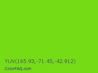 YUV 165.93,-71.45,-42.912 Color is a normal green color and the nearest color is Alien Armpit #84de02. Hex code #75db15 and RGB value is rgb(117,219,21). In RGB color space, this color is composed of 46% red, 86% green, 8% blue, In CMYK color space, this color is composed of 47% cyan, 0% magenta, 90% yellow , 14% black , In HSL color space, this color has a hue angle of 91° , 83% saturation and 47% lightness.