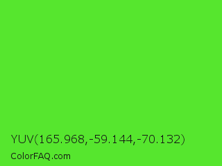 YUV 165.968,-59.144,-70.132 Color is a normal green color and the nearest color is Harlequin Green #46cb18. Hex code #56e62e and RGB value is rgb(86,230,46). In RGB color space, this color is composed of 34% red, 90% green, 18% blue, In CMYK color space, this color is composed of 63% cyan, 0% magenta, 80% yellow , 10% black , In HSL color space, this color has a hue angle of 107° , 79% saturation and 54% lightness.