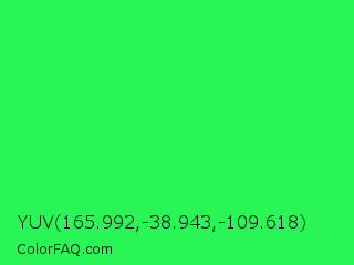 YUV 165.992,-38.943,-109.618 Color is a normal green color and the nearest color is Malachite #0bda51. Hex code #29f557 and RGB value is rgb(41,245,87). In RGB color space, this color is composed of 16% red, 96% green, 34% blue, In CMYK color space, this color is composed of 83% cyan, 0% magenta, 64% yellow , 4% black , In HSL color space, this color has a hue angle of 134° , 91% saturation and 56% lightness.