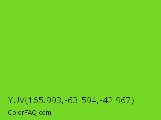 YUV 165.993,-63.594,-42.967 Color is a normal green color and the nearest color is Lima #76bd17. Hex code #75d825 and RGB value is rgb(117,216,37). In RGB color space, this color is composed of 46% red, 85% green, 15% blue, In CMYK color space, this color is composed of 46% cyan, 0% magenta, 83% yellow , 15% black , In HSL color space, this color has a hue angle of 93° , 71% saturation and 50% lightness.