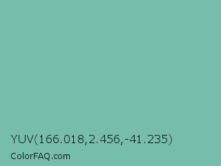 YUV 166.018,2.456,-41.235 Color is a normal cyan color and the nearest color is Gulf Stream #80b3ae. Hex code #77bdab and RGB value is rgb(119,189,171). In RGB color space, this color is composed of 47% red, 74% green, 67% blue, In CMYK color space, this color is composed of 37% cyan, 0% magenta, 10% yellow , 26% black , In HSL color space, this color has a hue angle of 165° , 35% saturation and 60% lightness.