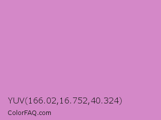 YUV 166.02,16.752,40.324 Color is a light magenta color and the nearest color is Shocking #e292c0. Hex code #d488c8 and RGB value is rgb(212,136,200). In RGB color space, this color is composed of 83% red, 53% green, 78% blue, In CMYK color space, this color is composed of 0% cyan, 36% magenta, 6% yellow , 17% black , In HSL color space, this color has a hue angle of 309° , 47% saturation and 68% lightness.