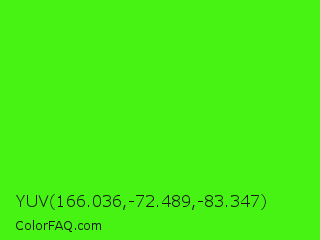 YUV 166.036,-72.489,-83.347 Color is a normal green color and the nearest color is Neon Green #39ff14. Hex code #47f313 and RGB value is rgb(71,243,19). In RGB color space, this color is composed of 28% red, 95% green, 7% blue, In CMYK color space, this color is composed of 71% cyan, 0% magenta, 92% yellow , 5% black , In HSL color space, this color has a hue angle of 106° , 90% saturation and 51% lightness.