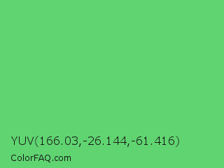 YUV 166.03,-26.144,-61.416 Color is a normal green color and the nearest color is Emerald #50c878. Hex code #60d471 and RGB value is rgb(96,212,113). In RGB color space, this color is composed of 38% red, 83% green, 44% blue, In CMYK color space, this color is composed of 55% cyan, 0% magenta, 47% yellow , 17% black , In HSL color space, this color has a hue angle of 129° , 57% saturation and 60% lightness.