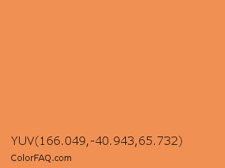 YUV 166.049,-40.943,65.732 Color is a light orange color and the nearest color is Big Foot Feet #e88e5a. Hex code #f19053 and RGB value is rgb(241,144,83). In RGB color space, this color is composed of 95% red, 56% green, 33% blue, In CMYK color space, this color is composed of 0% cyan, 40% magenta, 66% yellow , 5% black , In HSL color space, this color has a hue angle of 23° , 85% saturation and 64% lightness.