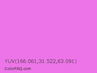 YUV 166.061,31.522,63.091 Color is a light magenta color and the nearest color is Lavender Magenta #ee82ee. Hex code #ee75e6 and RGB value is rgb(238,117,230). In RGB color space, this color is composed of 93% red, 46% green, 90% blue, In CMYK color space, this color is composed of 0% cyan, 51% magenta, 3% yellow , 7% black , In HSL color space, this color has a hue angle of 304° , 78% saturation and 70% lightness.