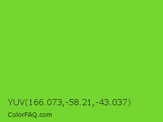 YUV 166.073,-58.21,-43.037 Color is a normal green color and the nearest color is Kiwi #8ee53f. Hex code #75d630 and RGB value is rgb(117,214,48). In RGB color space, this color is composed of 46% red, 84% green, 19% blue, In CMYK color space, this color is composed of 45% cyan, 0% magenta, 78% yellow , 16% black , In HSL color space, this color has a hue angle of 95° , 67% saturation and 51% lightness.