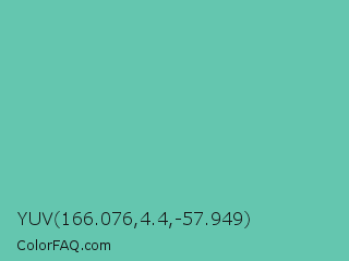 YUV 166.076,4.4,-57.949 Color is a normal cyan color and the nearest color is Tradewind #5fb3ac. Hex code #64c6af and RGB value is rgb(100,198,175). In RGB color space, this color is composed of 39% red, 78% green, 69% blue, In CMYK color space, this color is composed of 49% cyan, 0% magenta, 12% yellow , 22% black , In HSL color space, this color has a hue angle of 166° , 46% saturation and 58% lightness.