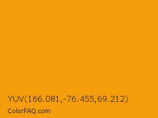 YUV 166.081,-76.455,69.212 Color is a normal orange color and the nearest color is Orange RYB #fb9902. Hex code #f59c0b and RGB value is rgb(245,156,11). In RGB color space, this color is composed of 96% red, 61% green, 4% blue, In CMYK color space, this color is composed of 0% cyan, 36% magenta, 96% yellow , 4% black , In HSL color space, this color has a hue angle of 37° , 92% saturation and 50% lightness.