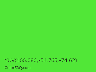 YUV 166.086,-54.765,-74.62 Color is a normal green color and the nearest color is Lime Green #32cd32. Hex code #51e737 and RGB value is rgb(81,231,55). In RGB color space, this color is composed of 32% red, 91% green, 22% blue, In CMYK color space, this color is composed of 65% cyan, 0% magenta, 76% yellow , 9% black , In HSL color space, this color has a hue angle of 111° , 79% saturation and 56% lightness.