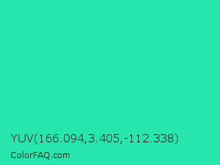 YUV 166.094,3.405,-112.338 Color is a normal green color and the nearest color is Turquoise PWG #30d5c8. Hex code #26e6ad and RGB value is rgb(38,230,173). In RGB color space, this color is composed of 15% red, 90% green, 68% blue, In CMYK color space, this color is composed of 83% cyan, 0% magenta, 25% yellow , 10% black , In HSL color space, this color has a hue angle of 162° , 79% saturation and 53% lightness.