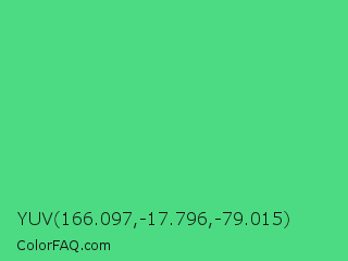 YUV 166.097,-17.796,-79.015 Color is a normal green color and the nearest color is Emerald #50c878. Hex code #4cdb82 and RGB value is rgb(76,219,130). In RGB color space, this color is composed of 30% red, 86% green, 51% blue, In CMYK color space, this color is composed of 65% cyan, 0% magenta, 41% yellow , 14% black , In HSL color space, this color has a hue angle of 143° , 67% saturation and 58% lightness.