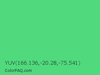 YUV 166.136,-20.28,-75.541 Color is a normal green color and the nearest color is Emerald #50c878. Hex code #50da7d and RGB value is rgb(80,218,125). In RGB color space, this color is composed of 31% red, 85% green, 49% blue, In CMYK color space, this color is composed of 63% cyan, 0% magenta, 43% yellow , 15% black , In HSL color space, this color has a hue angle of 140° , 65% saturation and 58% lightness.