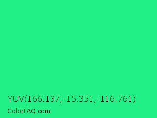 YUV 166.137,-15.351,-116.761 Color is a normal green color and the nearest color is Spring Green #00ff7f. Hex code #21f087 and RGB value is rgb(33,240,135). In RGB color space, this color is composed of 13% red, 94% green, 53% blue, In CMYK color space, this color is composed of 86% cyan, 0% magenta, 44% yellow , 6% black , In HSL color space, this color has a hue angle of 150° , 87% saturation and 54% lightness.