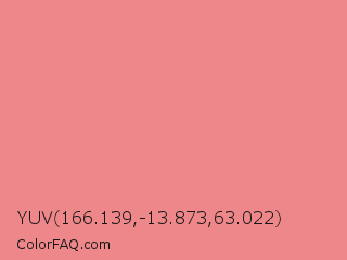 YUV 166.139,-13.873,63.022 Color is a light red color and the nearest color is Light Coral #f08080. Hex code #ee878a and RGB value is rgb(238,135,138). In RGB color space, this color is composed of 93% red, 53% green, 54% blue, In CMYK color space, this color is composed of 0% cyan, 43% magenta, 42% yellow , 7% black , In HSL color space, this color has a hue angle of 358° , 75% saturation and 73% lightness.