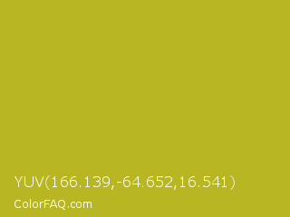 YUV 166.139,-64.652,16.541 Color is a normal yellow color and the nearest color is Acid Green #b0bf1a. Hex code #b9b623 and RGB value is rgb(185,182,35). In RGB color space, this color is composed of 73% red, 71% green, 14% blue, In CMYK color space, this color is composed of 0% cyan, 2% magenta, 81% yellow , 27% black , In HSL color space, this color has a hue angle of 59° , 68% saturation and 43% lightness.