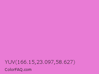 YUV 166.15,23.097,58.627 Color is a light magenta color and the nearest color is Orchid #da70d6. Hex code #e97bd5 and RGB value is rgb(233,123,213). In RGB color space, this color is composed of 91% red, 48% green, 84% blue, In CMYK color space, this color is composed of 0% cyan, 47% magenta, 9% yellow , 9% black , In HSL color space, this color has a hue angle of 311° , 71% saturation and 70% lightness.