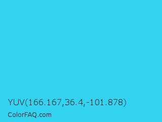 YUV 166.167,36.4,-101.878 Color is a normal cyan color and the nearest color is Scooter #2ebfd4. Hex code #32d3f0 and RGB value is rgb(50,211,240). In RGB color space, this color is composed of 20% red, 83% green, 94% blue, In CMYK color space, this color is composed of 79% cyan, 12% magenta, 0% yellow , 6% black , In HSL color space, this color has a hue angle of 189° , 86% saturation and 57% lightness.