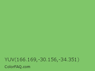 YUV 166.169,-30.156,-34.351 Color is a normal green color and the nearest color is Mantis #74c365. Hex code #7fc669 and RGB value is rgb(127,198,105). In RGB color space, this color is composed of 50% red, 78% green, 41% blue, In CMYK color space, this color is composed of 36% cyan, 0% magenta, 47% yellow , 22% black , In HSL color space, this color has a hue angle of 106° , 45% saturation and 59% lightness.