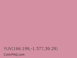 YUV 166.199,-1.577,39.29 Color is a light rose color and the nearest color is Can Can #d591a4. Hex code #d390a3 and RGB value is rgb(211,144,163). In RGB color space, this color is composed of 83% red, 56% green, 64% blue, In CMYK color space, this color is composed of 0% cyan, 32% magenta, 23% yellow , 17% black , In HSL color space, this color has a hue angle of 343° , 43% saturation and 70% lightness.