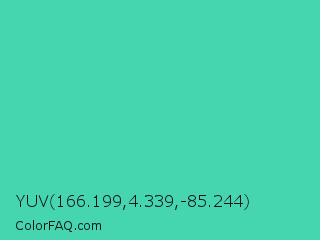YUV 166.199,4.339,-85.244 Color is a normal cyan color and the nearest color is Eucalyptus #44d7a8. Hex code #45d6af and RGB value is rgb(69,214,175). In RGB color space, this color is composed of 27% red, 84% green, 69% blue, In CMYK color space, this color is composed of 68% cyan, 0% magenta, 18% yellow , 16% black , In HSL color space, this color has a hue angle of 164° , 64% saturation and 55% lightness.