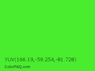 YUV 166.19,-59.254,-81.728 Color is a normal green color and the nearest color is Neon Green #39ff14. Hex code #49ed2e and RGB value is rgb(73,237,46). In RGB color space, this color is composed of 29% red, 93% green, 18% blue, In CMYK color space, this color is composed of 69% cyan, 0% magenta, 81% yellow , 7% black , In HSL color space, this color has a hue angle of 112° , 84% saturation and 55% lightness.