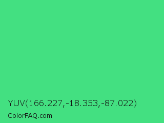 YUV 166.227,-18.353,-87.022 Color is a normal green color and the nearest color is UFO Green #3cd070. Hex code #43e081 and RGB value is rgb(67,224,129). In RGB color space, this color is composed of 26% red, 88% green, 51% blue, In CMYK color space, this color is composed of 70% cyan, 0% magenta, 42% yellow , 12% black , In HSL color space, this color has a hue angle of 144° , 72% saturation and 57% lightness.
