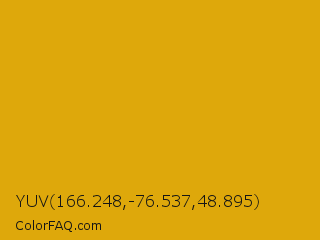 YUV 166.248,-76.537,48.895 Color is a normal orange color and the nearest color is Galliano #dcb20c. Hex code #dea80b and RGB value is rgb(222,168,11). In RGB color space, this color is composed of 87% red, 66% green, 4% blue, In CMYK color space, this color is composed of 0% cyan, 24% magenta, 95% yellow , 13% black , In HSL color space, this color has a hue angle of 45° , 91% saturation and 46% lightness.