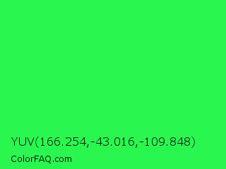 YUV 166.254,-43.016,-109.848 Color is a normal green color and the nearest color is Malachite #0bda51. Hex code #29f74f and RGB value is rgb(41,247,79). In RGB color space, this color is composed of 16% red, 97% green, 31% blue, In CMYK color space, this color is composed of 83% cyan, 0% magenta, 68% yellow , 3% black , In HSL color space, this color has a hue angle of 131° , 93% saturation and 56% lightness.