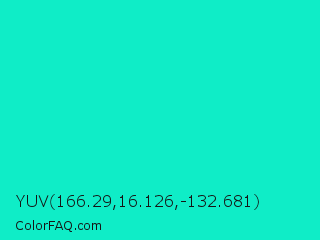 YUV 166.29,16.126,-132.681 Color is a normal cyan color and the nearest color is Bright Turquoise #08e8de. Hex code #0fedc7 and RGB value is rgb(15,237,199). In RGB color space, this color is composed of 6% red, 93% green, 78% blue, In CMYK color space, this color is composed of 94% cyan, 0% magenta, 16% yellow , 7% black , In HSL color space, this color has a hue angle of 170° , 88% saturation and 49% lightness.
