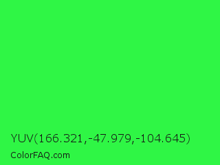 YUV 166.321,-47.979,-104.645 Color is a normal green color and the nearest color is Lime Green #32cd32. Hex code #2ff645 and RGB value is rgb(47,246,69). In RGB color space, this color is composed of 18% red, 96% green, 27% blue, In CMYK color space, this color is composed of 81% cyan, 0% magenta, 72% yellow , 4% black , In HSL color space, this color has a hue angle of 127° , 92% saturation and 57% lightness.