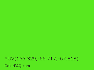 YUV 166.329,-66.717,-67.818 Color is a normal green color and the nearest color is Harlequin Green #46cb18. Hex code #59e81f and RGB value is rgb(89,232,31). In RGB color space, this color is composed of 35% red, 91% green, 12% blue, In CMYK color space, this color is composed of 62% cyan, 0% magenta, 87% yellow , 9% black , In HSL color space, this color has a hue angle of 103° , 81% saturation and 52% lightness.