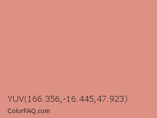 YUV 166.356,-16.445,47.923 Color is a light red color and the nearest color is My Pink #d69188. Hex code #dd9185 and RGB value is rgb(221,145,133). In RGB color space, this color is composed of 87% red, 57% green, 52% blue, In CMYK color space, this color is composed of 0% cyan, 34% magenta, 40% yellow , 13% black , In HSL color space, this color has a hue angle of 8° , 56% saturation and 69% lightness.