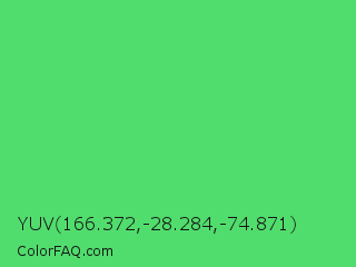 YUV 166.372,-28.284,-74.871 Color is a normal green color and the nearest color is Emerald #50c878. Hex code #51dd6d and RGB value is rgb(81,221,109). In RGB color space, this color is composed of 32% red, 87% green, 43% blue, In CMYK color space, this color is composed of 63% cyan, 0% magenta, 51% yellow , 13% black , In HSL color space, this color has a hue angle of 132° , 67% saturation and 59% lightness.