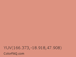 YUV 166.373,-18.918,47.908 Color is a light red color and the nearest color is My Pink #d69188. Hex code #dd9280 and RGB value is rgb(221,146,128). In RGB color space, this color is composed of 87% red, 57% green, 50% blue, In CMYK color space, this color is composed of 0% cyan, 34% magenta, 42% yellow , 13% black , In HSL color space, this color has a hue angle of 12° , 58% saturation and 68% lightness.