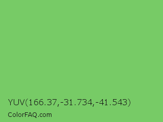 YUV 166.37,-31.734,-41.543 Color is a normal green color and the nearest color is Mantis #74c365. Hex code #77cb66 and RGB value is rgb(119,203,102). In RGB color space, this color is composed of 47% red, 80% green, 40% blue, In CMYK color space, this color is composed of 41% cyan, 0% magenta, 50% yellow , 20% black , In HSL color space, this color has a hue angle of 110° , 49% saturation and 60% lightness.