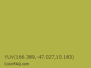 YUV 166.389,-47.027,10.183 Color is a normal yellow color and the nearest color is Brass #b5a642. Hex code #b2b347 and RGB value is rgb(178,179,71). In RGB color space, this color is composed of 70% red, 70% green, 28% blue, In CMYK color space, this color is composed of 1% cyan, 0% magenta, 60% yellow , 30% black , In HSL color space, this color has a hue angle of 61° , 43% saturation and 49% lightness.