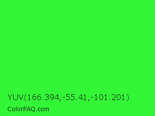 YUV 166.394,-55.41,-101.201 Color is a normal green color and the nearest color is Neon Green #39ff14. Hex code #33f736 and RGB value is rgb(51,247,54). In RGB color space, this color is composed of 20% red, 97% green, 21% blue, In CMYK color space, this color is composed of 79% cyan, 0% magenta, 78% yellow , 3% black , In HSL color space, this color has a hue angle of 121° , 92% saturation and 58% lightness.