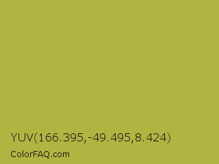YUV 166.395,-49.495,8.424 Color is a normal yellow color and the nearest color is Brass #b5a642. Hex code #b0b542 and RGB value is rgb(176,181,66). In RGB color space, this color is composed of 69% red, 71% green, 26% blue, In CMYK color space, this color is composed of 3% cyan, 0% magenta, 64% yellow , 29% black , In HSL color space, this color has a hue angle of 63° , 47% saturation and 48% lightness.