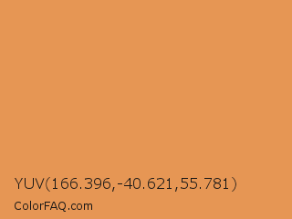 YUV 166.396,-40.621,55.781 Color is a light orange color and the nearest color is Big Foot Feet #e88e5a. Hex code #e69654 and RGB value is rgb(230,150,84). In RGB color space, this color is composed of 90% red, 59% green, 33% blue, In CMYK color space, this color is composed of 0% cyan, 35% magenta, 63% yellow , 10% black , In HSL color space, this color has a hue angle of 27° , 74% saturation and 62% lightness.